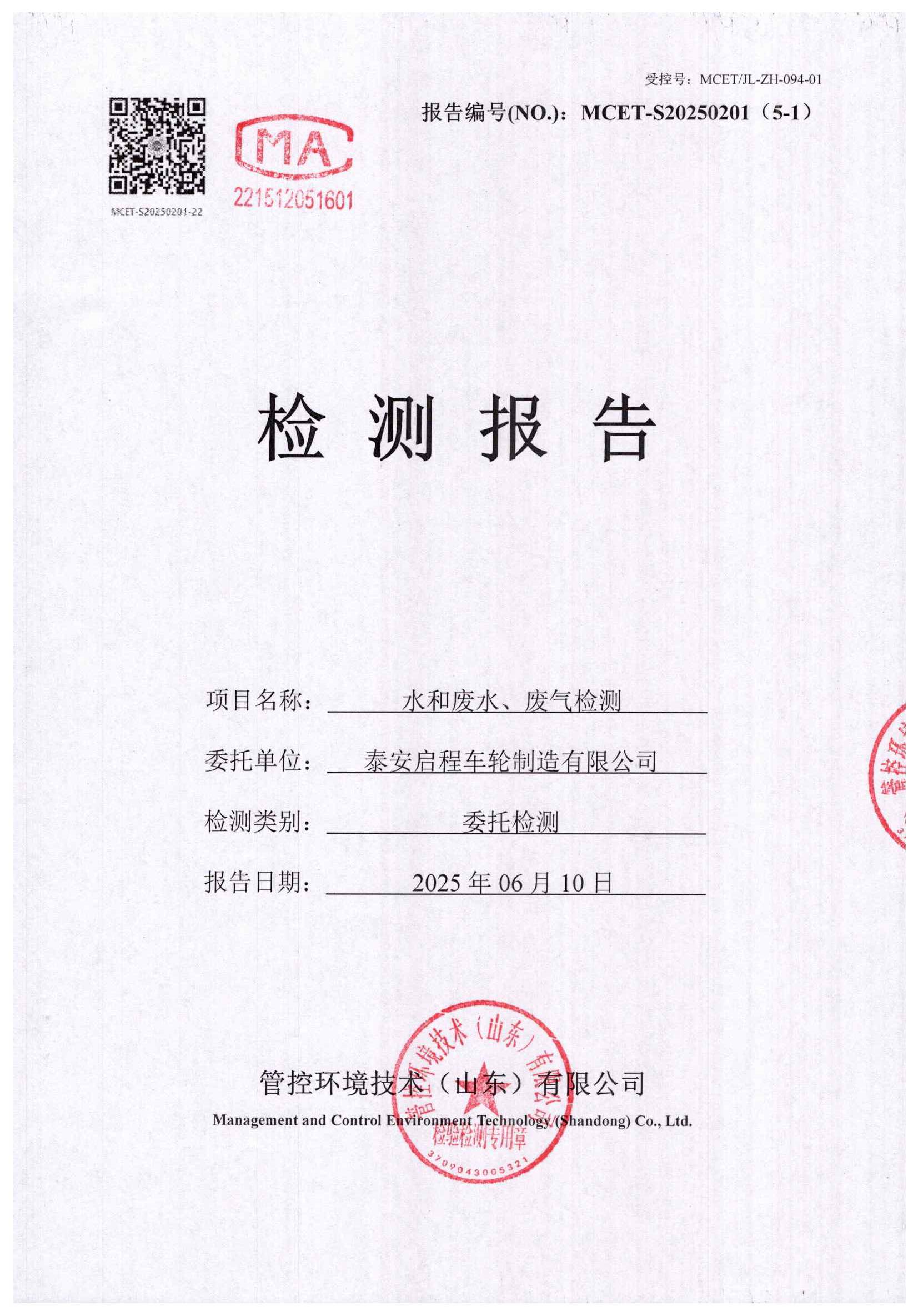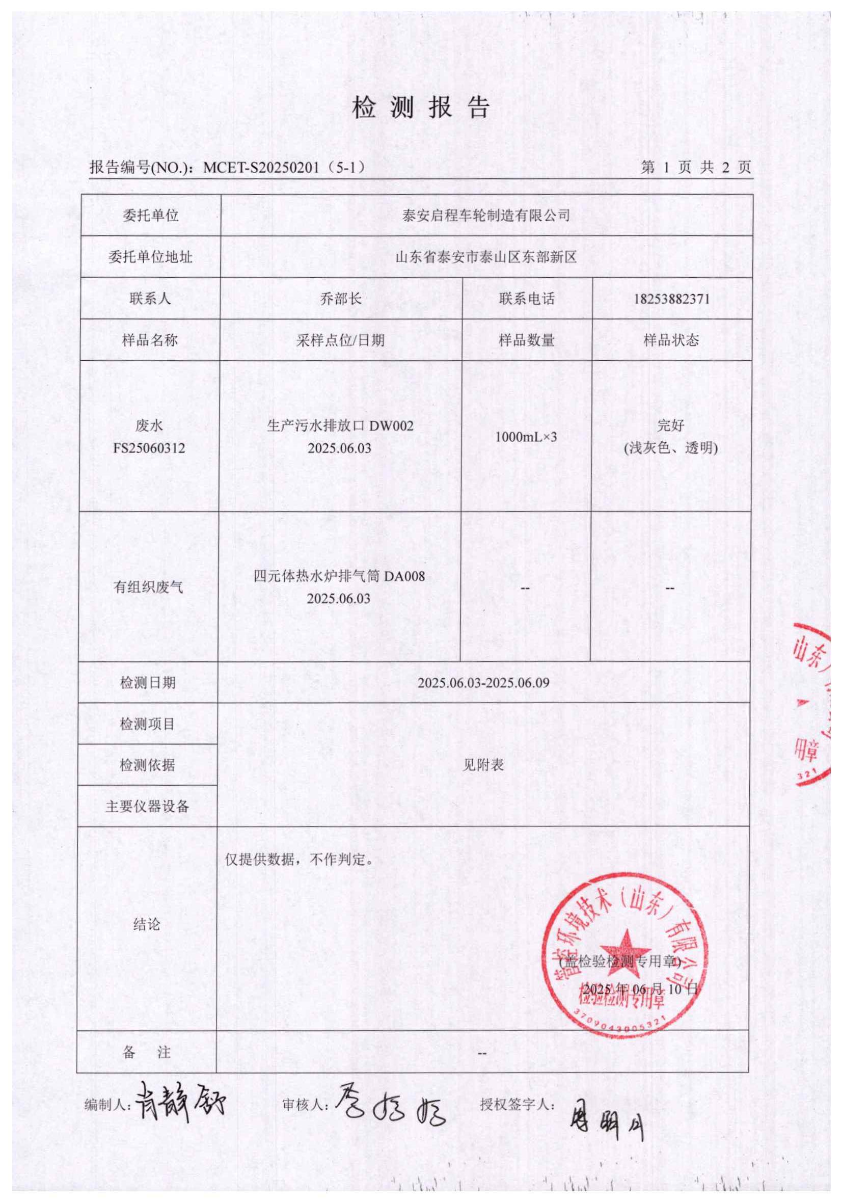 泰安啟程車輪制造有限公司2025年6月份環(huán)境污染物排放檢測報告