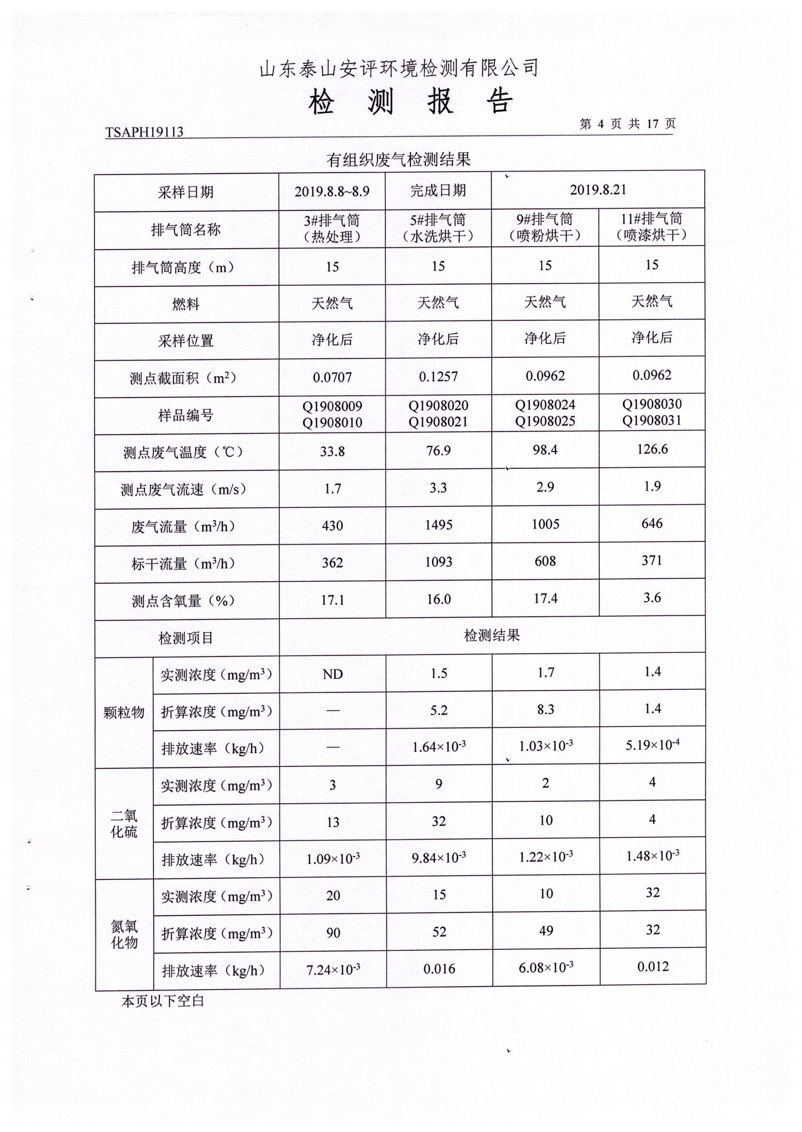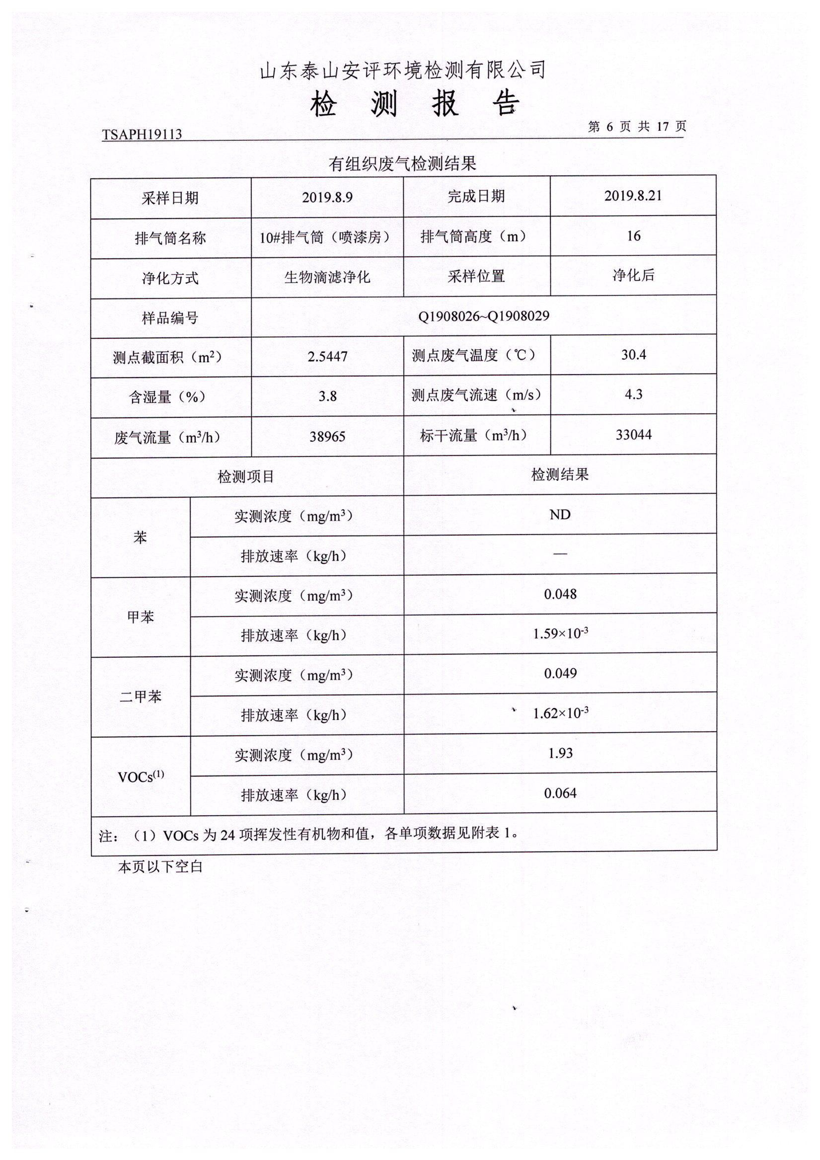 啟程公司主要廢氣排放口位于廠區(qū)北側和南側:北側編號DA001/ DA002,執(zhí)行《山東省區(qū)域性大氣污染物綜合排放標準》(DB37/ 2376—2019)標準: SO2≤50 mg/ m3,Nox≤100mg/ m3,顆粒物≤10mg/ m3。實際排放濃度:SO2 4mg/ m3,Nox 10mg/ m3,顆粒物 5.4mg/ m3。南側編號DA010,,執(zhí)行《揮發(fā)性有機物排放標準第5部分: 表面涂裝行業(yè)》(DB37 2801.5—2018)表2標準: 苯≤0.5mg/ m3,甲苯≤1.5mg/ m3,二甲苯≤5mg/ m3,VOCs≤50mg/ m3。實際排放濃度:苯ND(未檢出),甲苯≤0.049mg/ m3,二甲苯≤0.048mg/ m3,VOCs≤1.93mg/ m3。廢氣排放均經(jīng)過處理設施有組織排放。