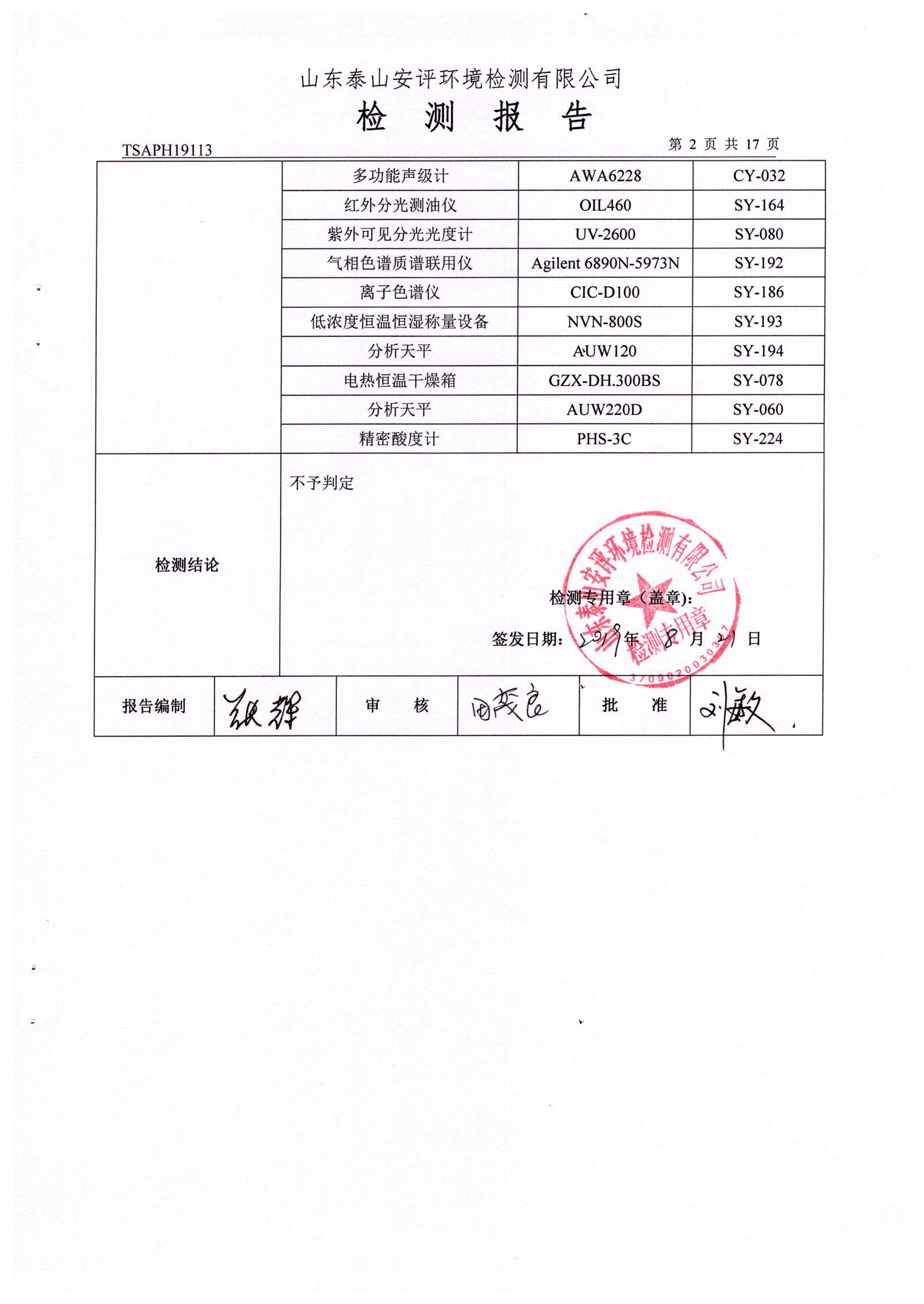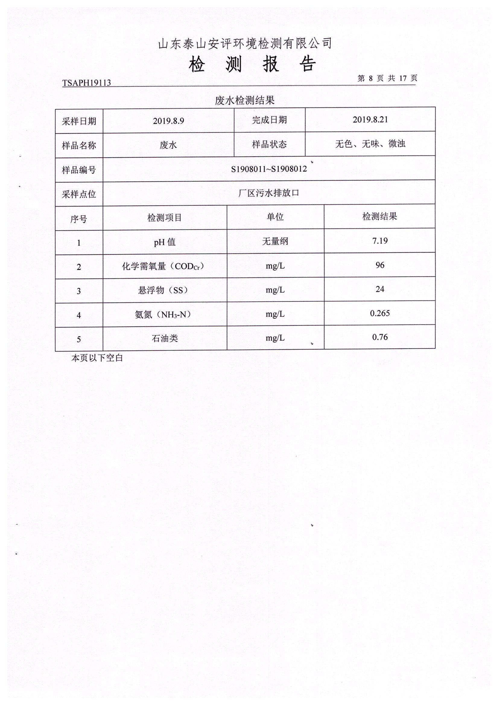 500mg/L,NH3-N 45mg/L, SS 250mg/L。實際監(jiān)測排放濃度:CODcr 96mg/L,NH3-N 0.265mg/L,SS 24mg/L。污水經(jīng)工業(yè)園區(qū)污水管網(wǎng)排往泰安嘉誠水質凈化有限公司處理。
