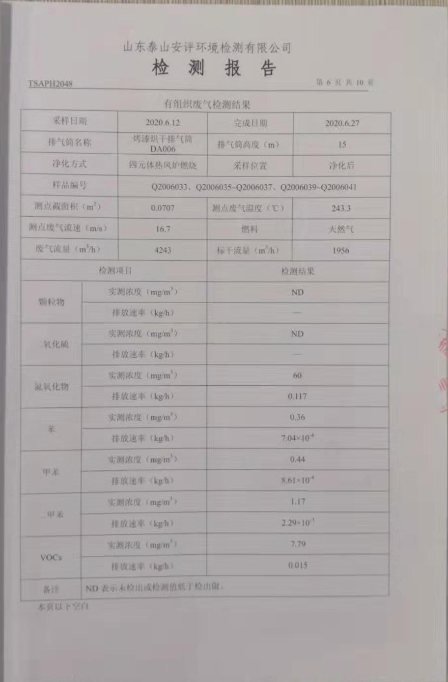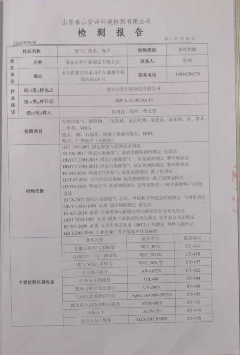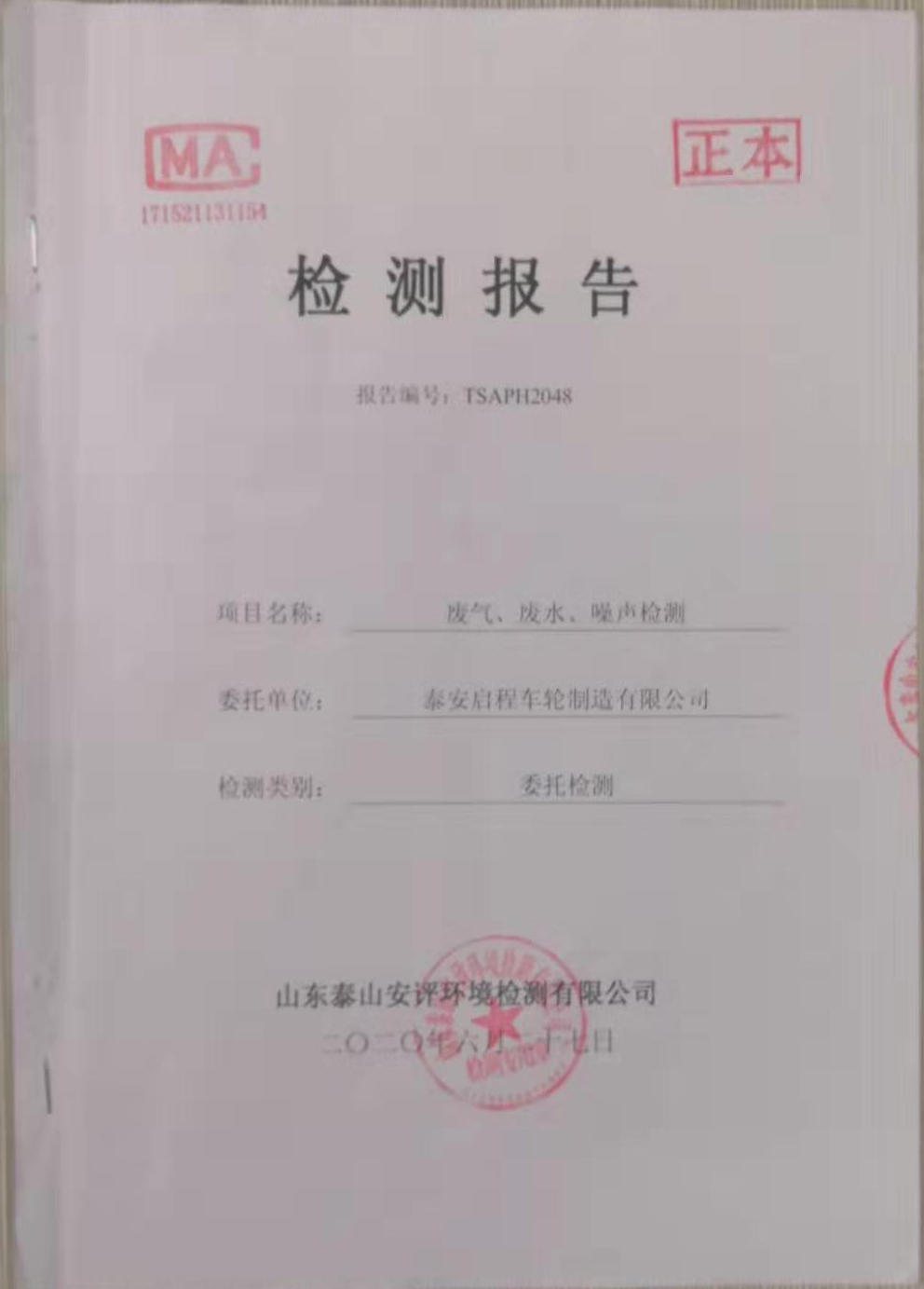 泰安啟程車輪制造有限公司2020年6月份環(huán)境污染物排放檢測報(bào)告
