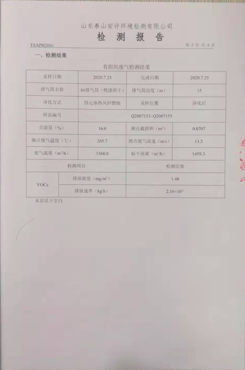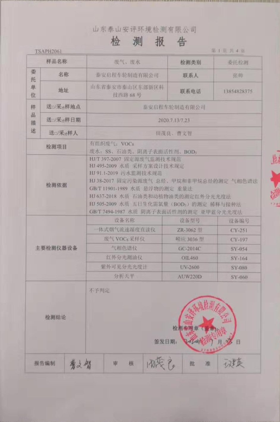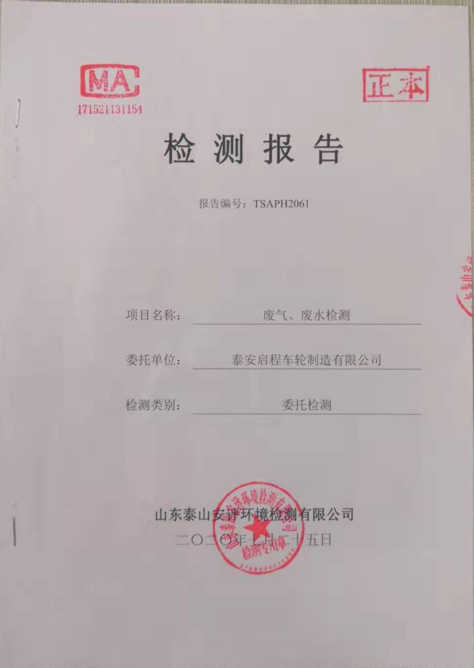 泰安啟程車輪制造有限公司2020年7月份環(huán)境污染物排放檢測(cè)報(bào)告