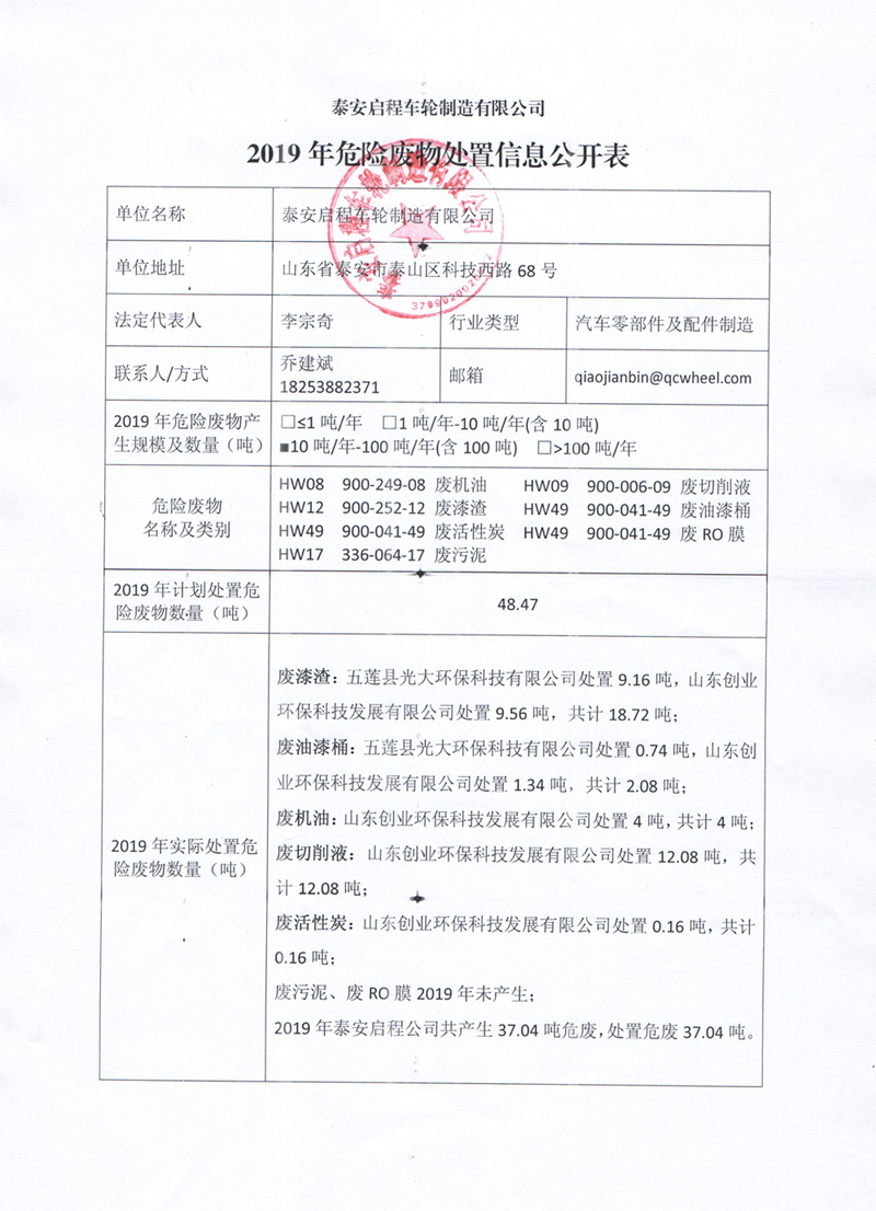 泰安啟程車輪制造有限公司危險廢物處置信息公開
