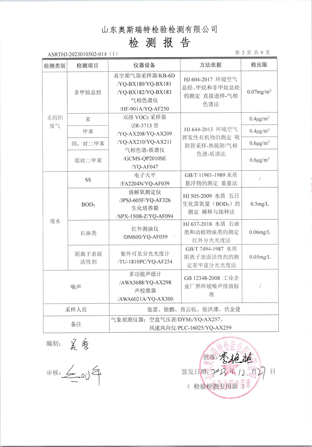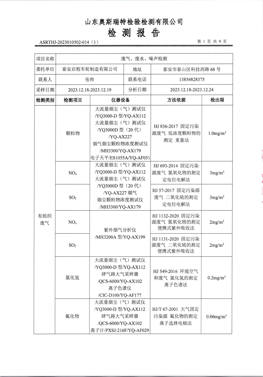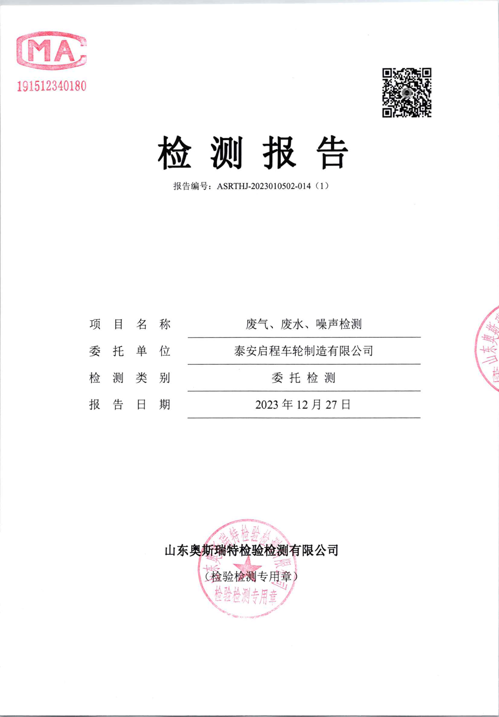 泰安啟程車輪制造有限公司2023年12月份環(huán)境污染物排放檢測報(bào)告