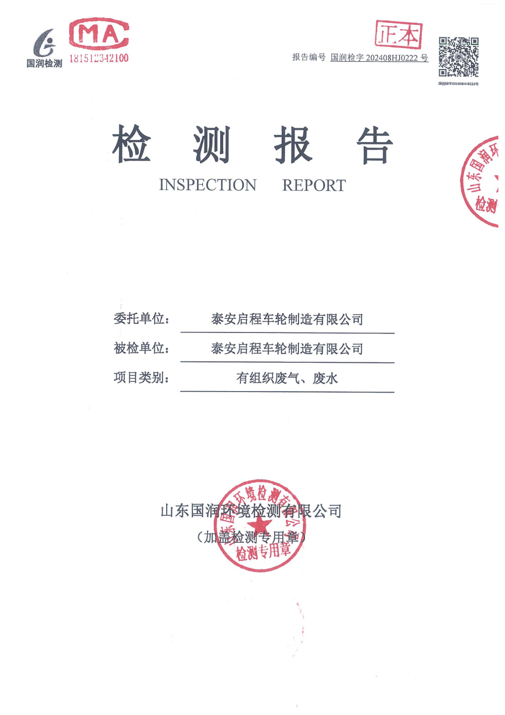 泰安啟程車輪制造有限公司2024年8月份環(huán)境污染物排放檢測報告
