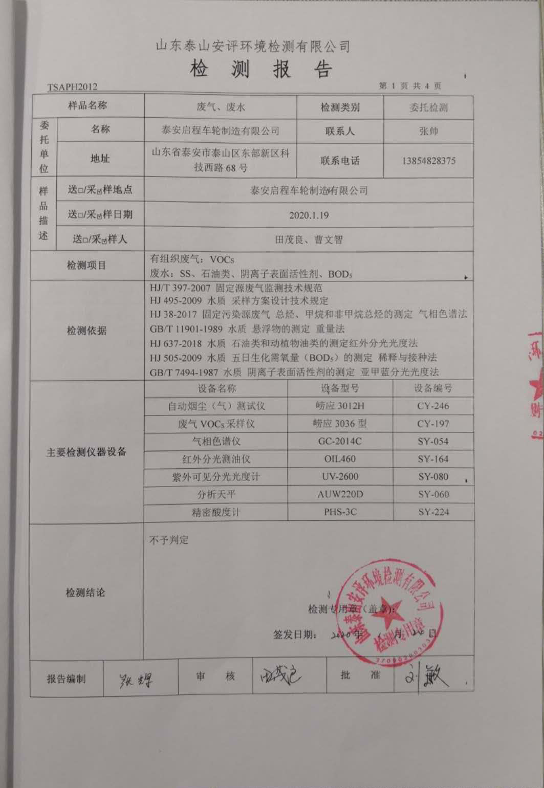 泰安啟程車輪制造有限公司2020年1月份環(huán)境污染物排放檢測(cè)報(bào)告