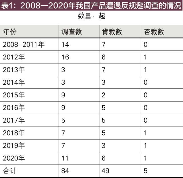 2020年,我國出口產(chǎn)品遭受11起反規(guī)避調(diào)查,增加4起,增幅57.1%;肯定性裁決6起,增加3起,增幅100%,已成為我國企業(yè)不可忽視的經(jīng)營風(fēng)險(如表1所示)。