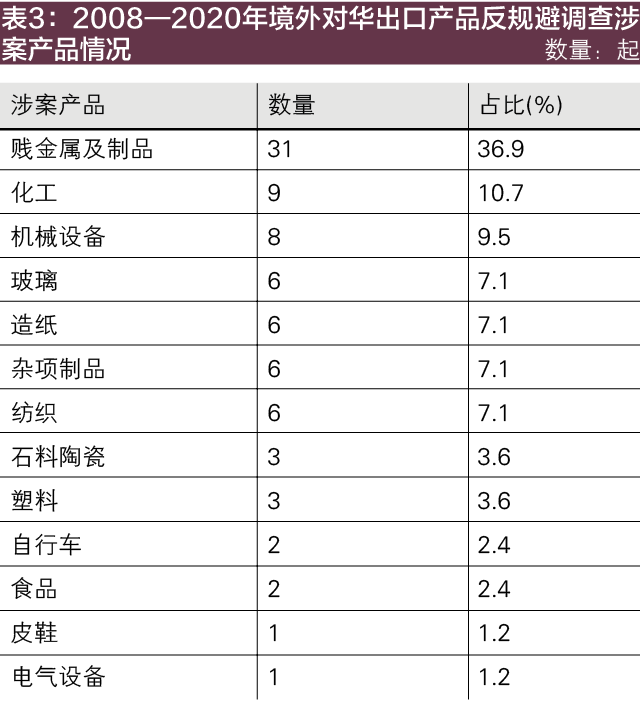 2008—2020年,我國出口產(chǎn)品遭遇的84起反規(guī)避調(diào)查涉及賤金屬及其制品31起,居首位,占36.9%;其次為化工品9起,占10.7%;機械設(shè)備則以8起居第三位,占9.5%;其中,賤金屬及制品主要涉及鋼鐵及制品(25起)、鋁及鋁制品(4起)和鉬絲(2起)。因此,鋼鐵及其制品是反規(guī)避調(diào)查的重災(zāi)區(qū)(如表3所示)。