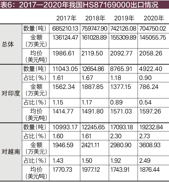 涉案產(chǎn)品印度海關(guān)編碼為87169010,但由于我國海關(guān)無該編碼,擬以HS87169000(掛車、半掛車及非機動車用零件)作為替代編碼進行分析(如表6所示)。