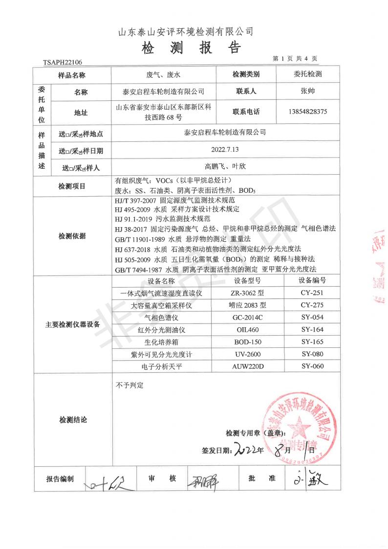 泰安啟程車輪制造有限公司2022年7月份環(huán)境污染物排放檢測(cè)報(bào)告