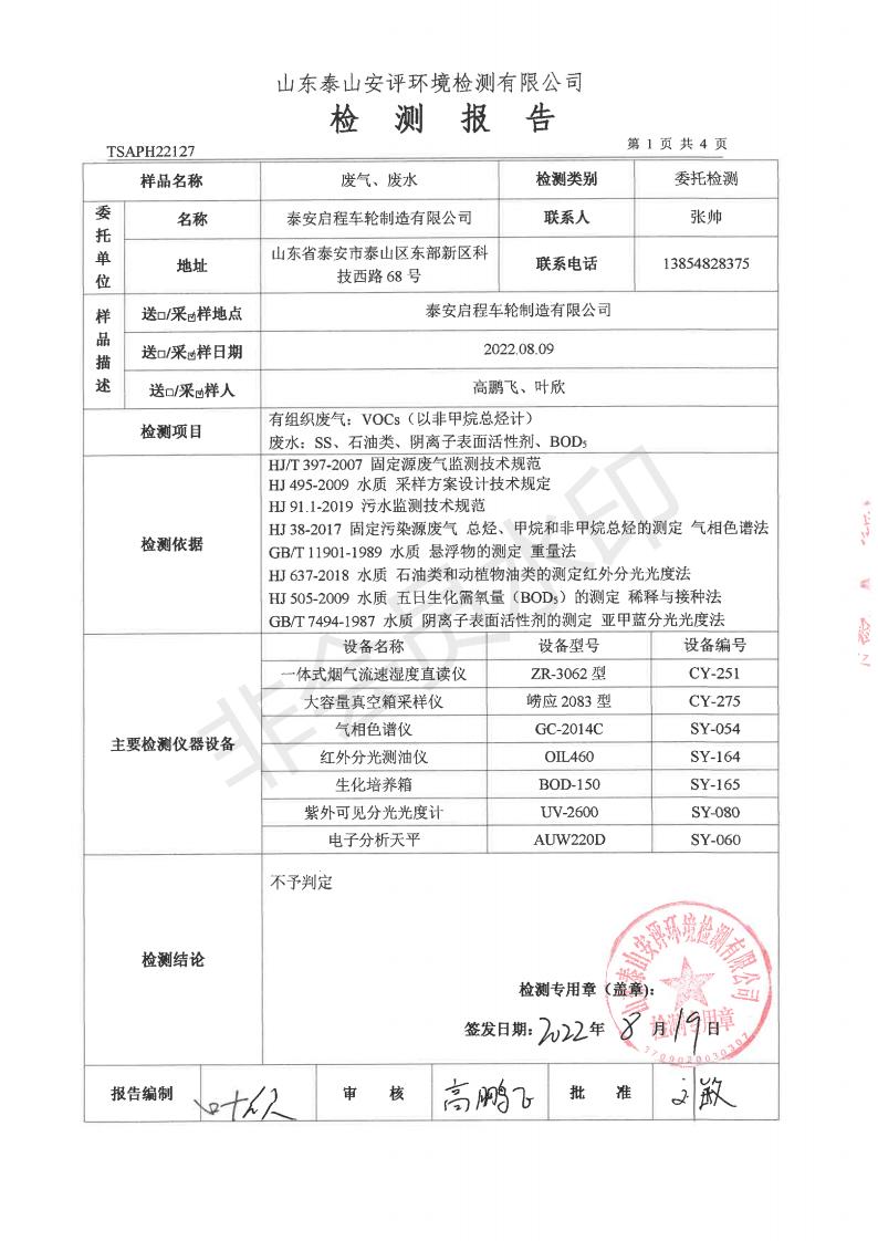 泰安啟程車輪制造有限公司2022年8月份環(huán)境污染物排放檢測報告